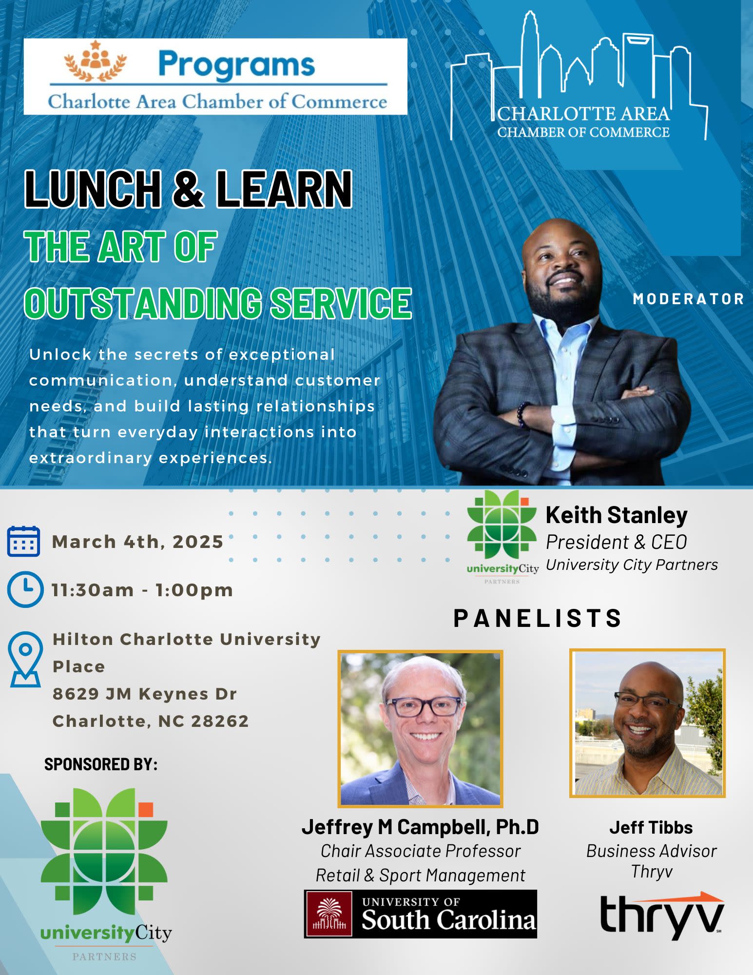 Join the Charlotte Area Chamber for an engaging and insightful Lunch & Learn event: The Art of Outstanding Service. This dynamic panel discussion will dive into why top-tier customer service is a game-changer for your business and how to create a service culture that sets you apart from the competition.
