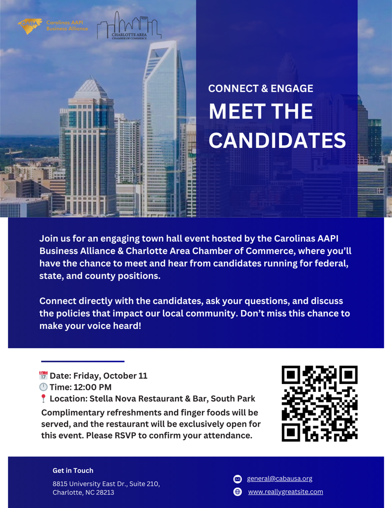 Join us for an engaging town hall event hosted by the Carolinas AAPI Business Alliance & Charlotte Area Chamber of Commerce, where you’ll have the chance to meet and hear from candidates running for federal, state, and county positions.