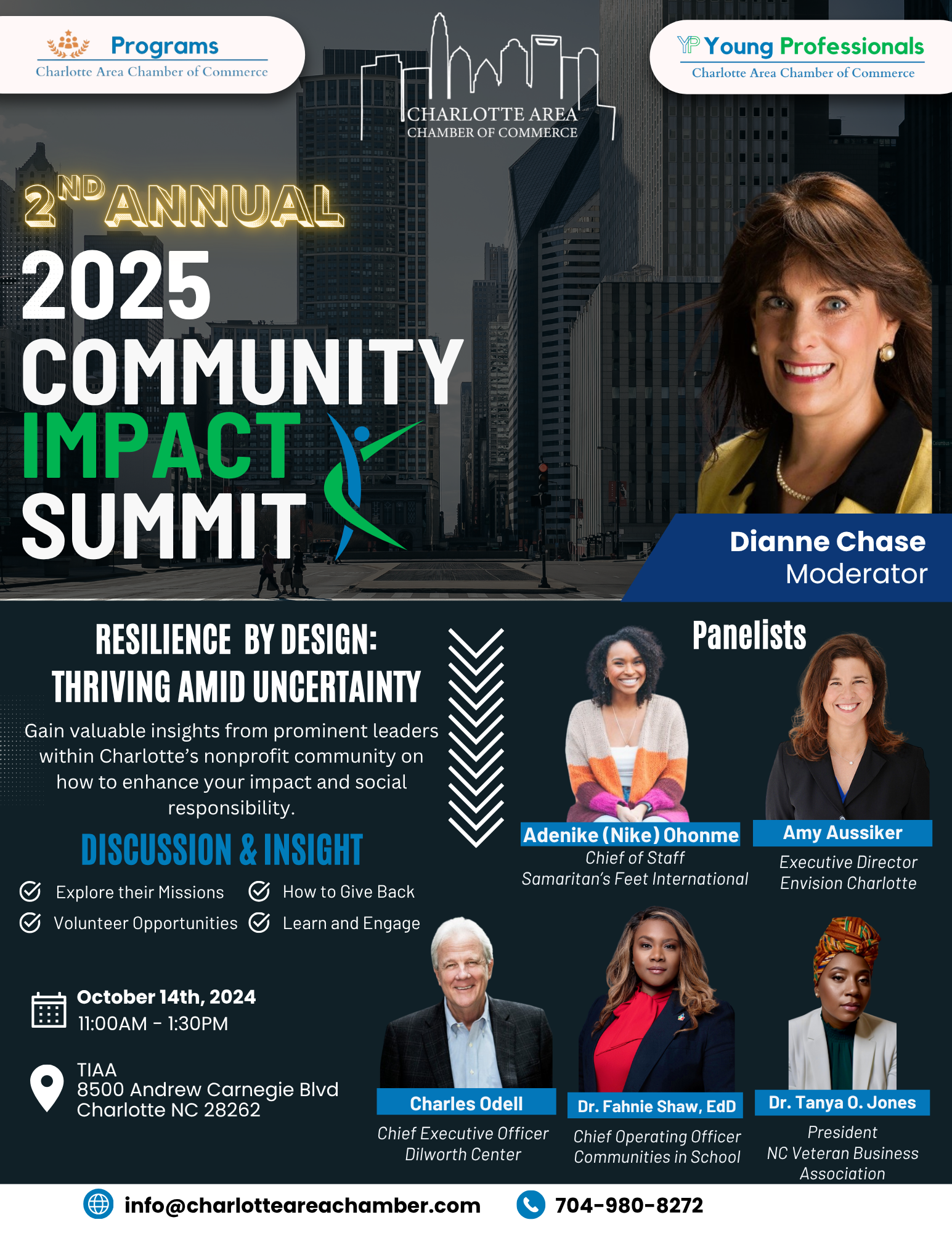 We are thrilled to announce that Dianne Chase will be our Moderator for our 2nd Annual Community Impact Summit with the Charlotte Area Chamber of Commerce Programs and Young Professional Committee on October 14th, 2025, at TIAA!