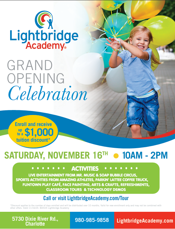 Join us in celebrating the grand opening of Lightbridge Academy of Steele Creek in the Charlotte area! This exciting event will feature live entertainment, games, arts & crafts, and much more for the whole family to enjoy. Lightbridge Academy is dedicated to "child care at its best," offering more than traditional daycare by creating a nurturing, family-centered environment where children, families, staff, and the community are all supported and valued. Their unique philosophy is rooted in fostering growth, learning, and connection—ensuring that every child receives exceptional care, and every family finds a true sense of belonging. We look forward to seeing you there as we welcome this wonderful addition to our community!