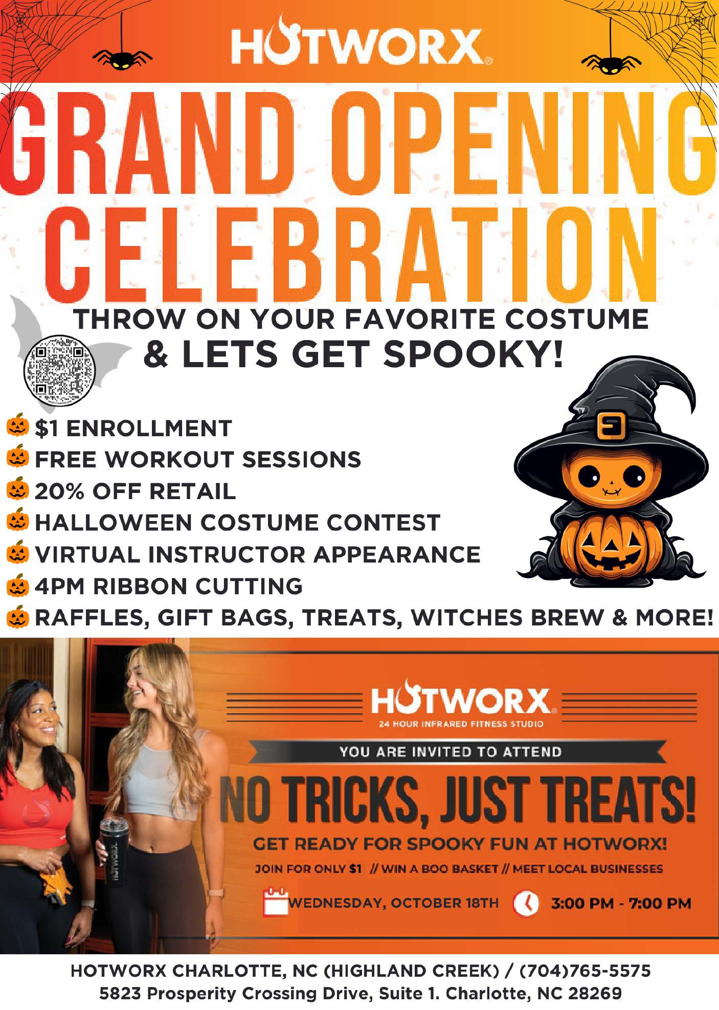 Please join us for the Grand Opening and Ribbon Cutting Celebration for HOTWORX Studio - Highland Creek! This Halloween themed grand opening will have a costume contest, goodie bags, snacks, drinks and one of their virtual instructors will be on site to work out and take photos. Show your support for this business in our Charlotte Community and help them celebrate at their grand opening party.