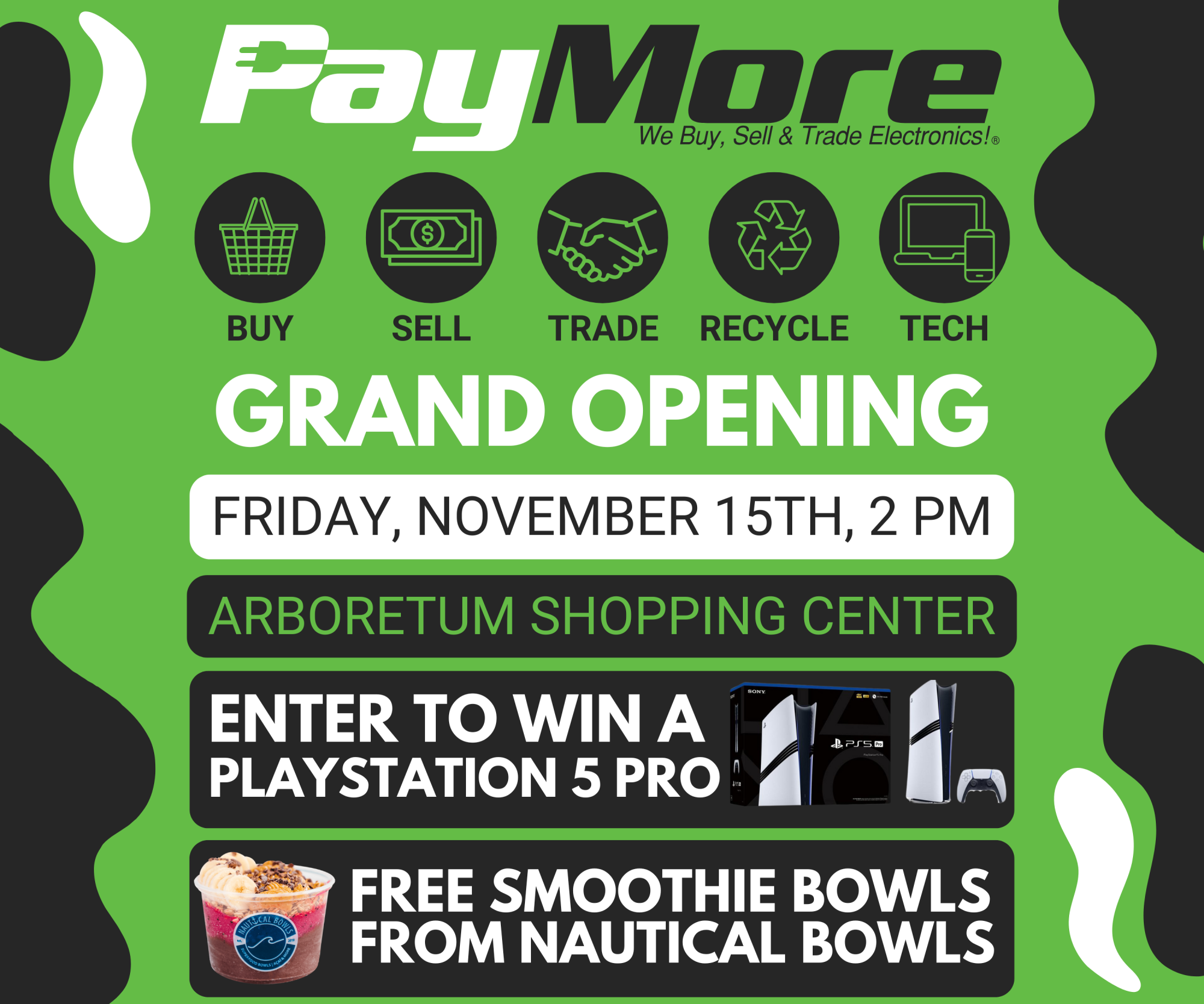 Join us for the ribbon cutting and grand opening of PayMore® Raintree in the Charlotte Area on Friday, November 15th, 2024! This event will feature a variety of giveaways, including a chance to win a PlayStation 5 Pro! Come show your support for this new business in our community and help us celebrate their special day. Mark your calendars for November 15th and be part of this exciting grand opening celebration!