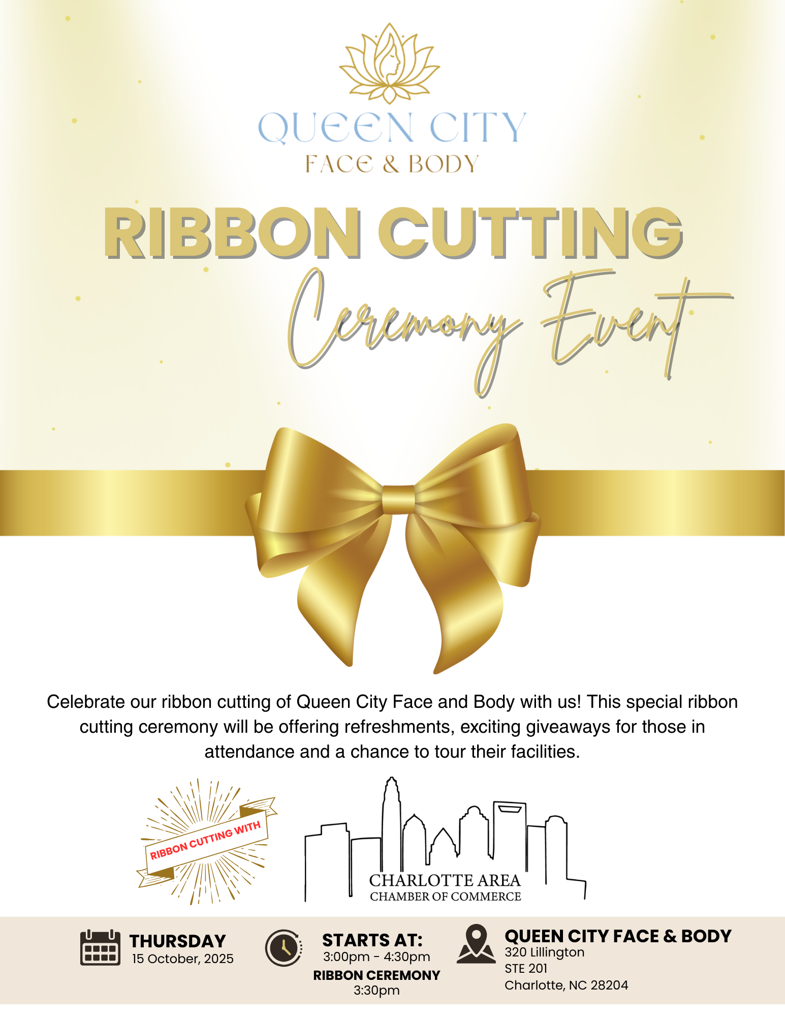 Come explore their beautiful new space and discover why Queen City Face and Body is set to become Charlotte’s go-to destination for advanced skincare, beauty, and wellness. This special ribbon cutting ceremony will feature refreshments, exciting giveaways for attendees, and the opportunity to tour their facilities.