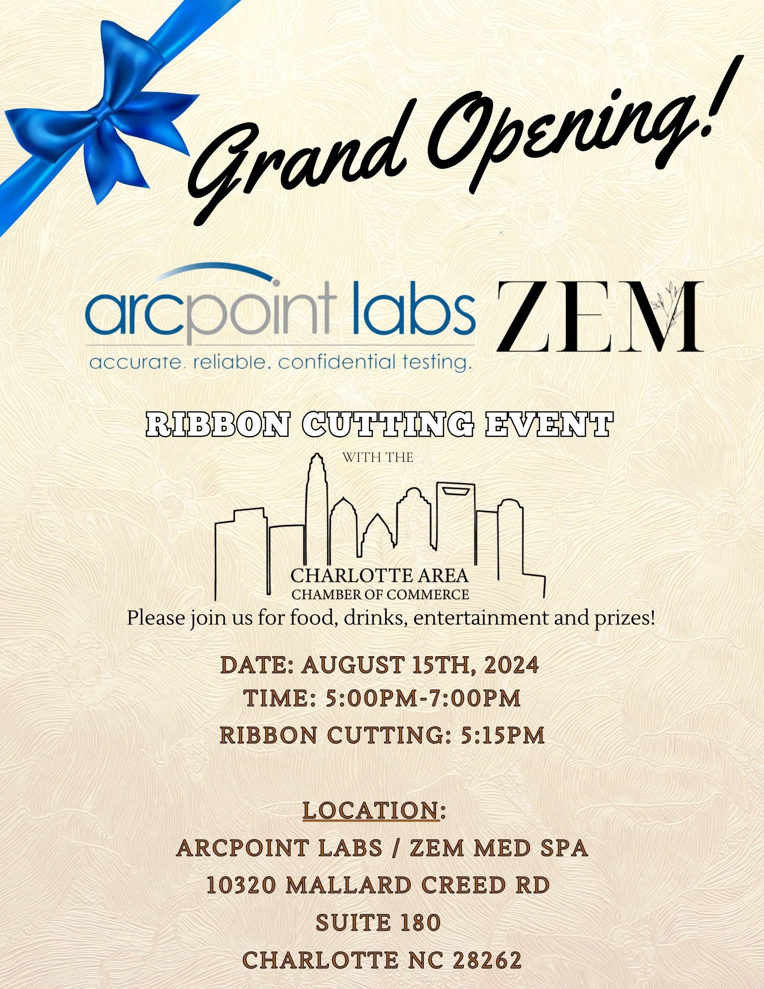 Join us in welcoming ARCPoint Labs / ZEM Med Spa to Charlotte as we host their ribbon-cutting ceremony which will officially mark the facility's opening, with our new med spa / skin-care specialists in town! So let's give them a warm welcome and we celebrate the beginning of a new chapter in skincare and wellness in the Charlotte community.