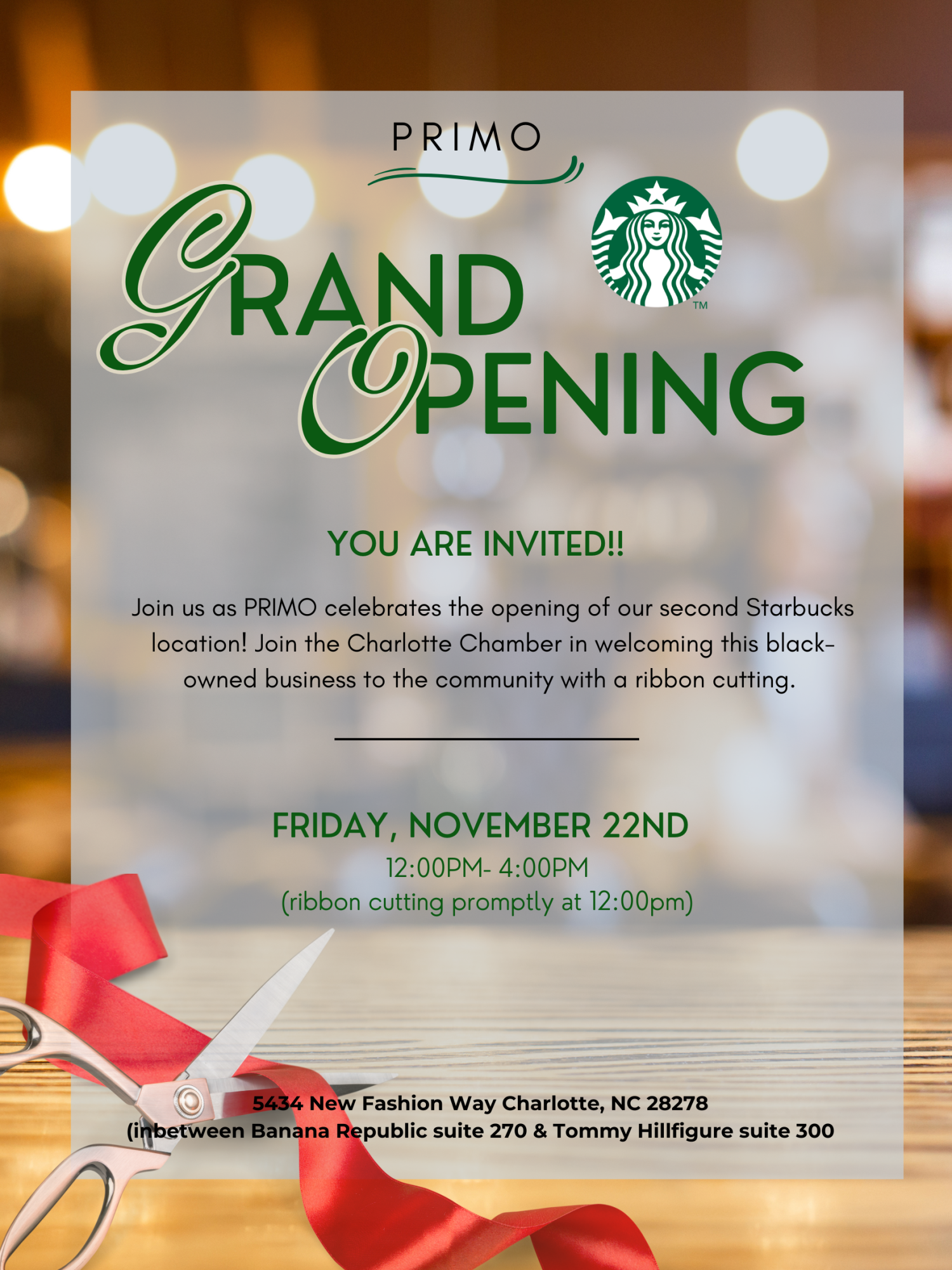 Please join us for a ribbon cutting to celebrate the grand opening of Primo Partners LLC's second Starbucks location located in the Charlotte Premium Outlets! There will be small pastry bites and delicious beverages served during this ribbon-cutting event.