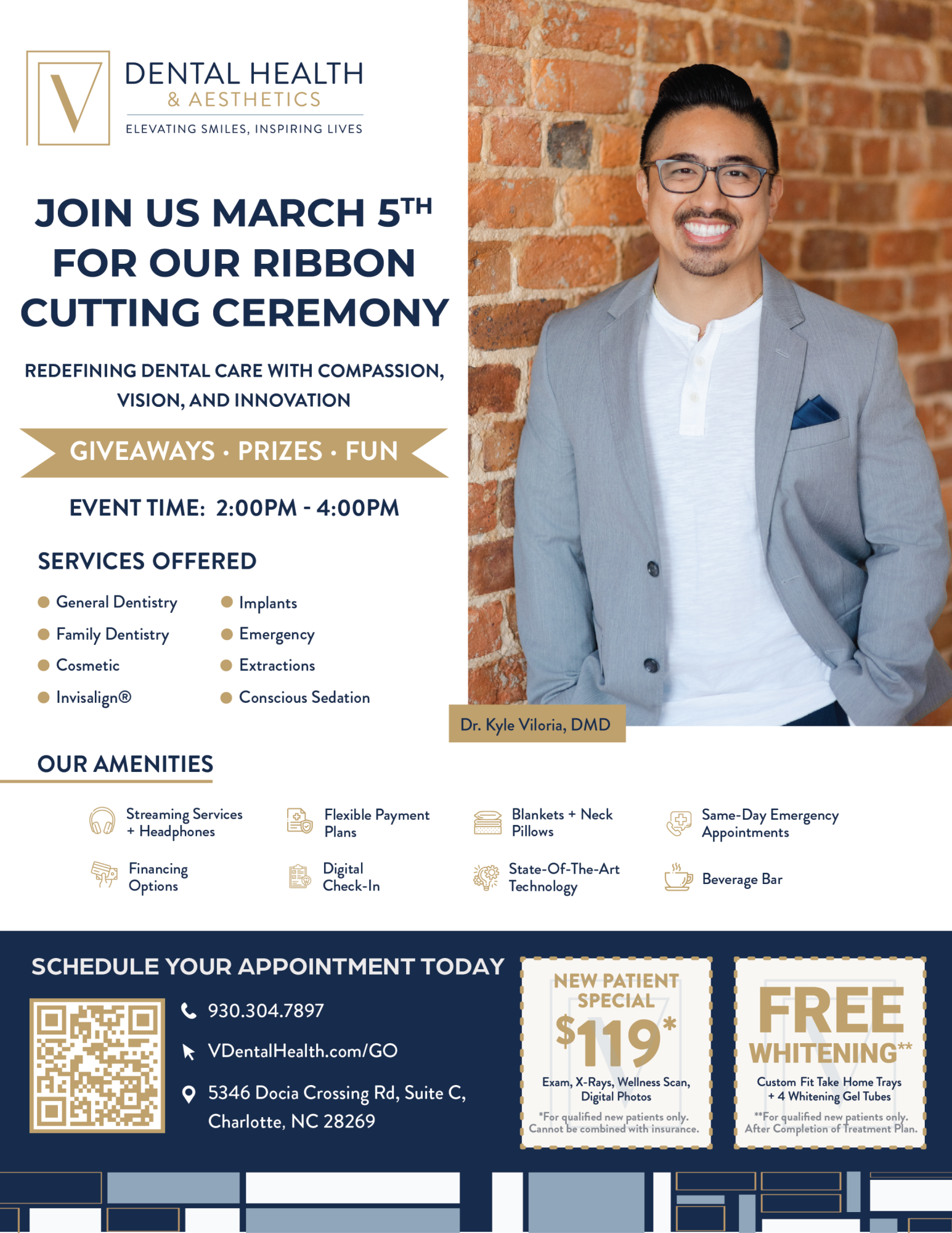 Please join us for a ribbon cutting ceremony as we welcome V Dental Health & Aesthetics to the Charlotte community on March 5th, 2025! Enjoy light refreshments and hors d'oeuvres, meet Dr. Kyle Viloria, DMD, get a chance to tour the office, and discover their unique approach and vision for dentistry.