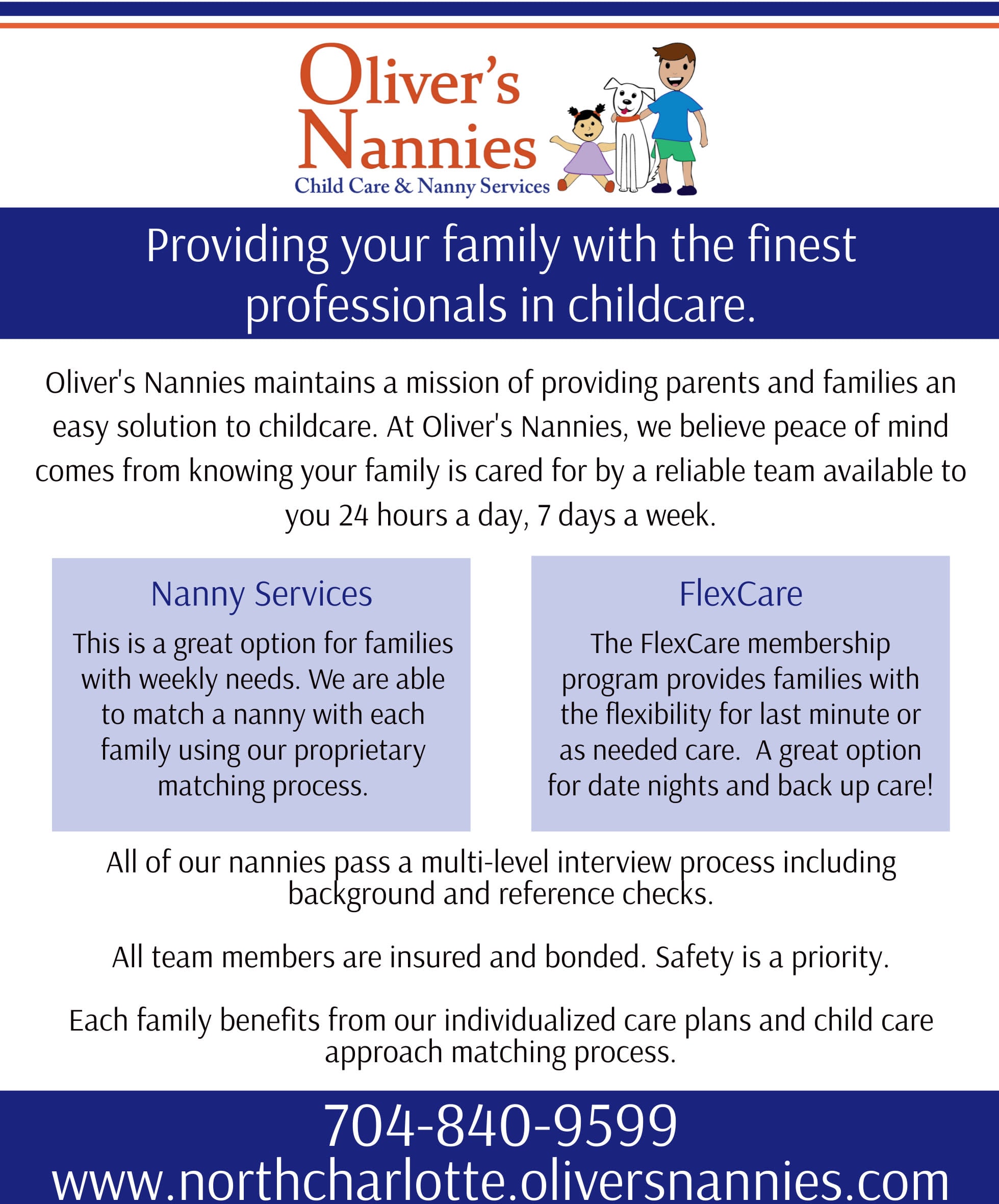 Oliver's Nannies is offering Charlotte Chamber members a one-time $250 discount off the Membership Fee or Registration Fee for any of our services. We offer 24/7 childcare options for families need PT/FT nanny help or our FlexCare (as needed care) options for families looking for help on a less frequent basis.