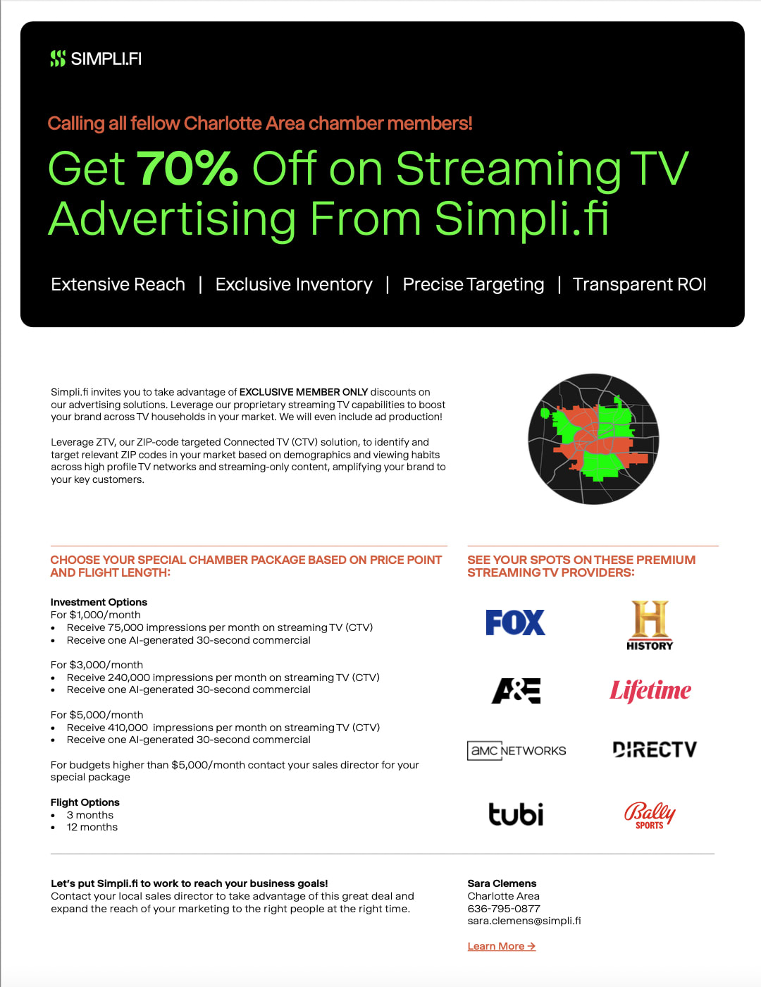 Simpli.fi invites you to take advantage of EXCLUSIVE MEMBER ONLY discounts on our advertising solutions. Leverage our proprietary streaming TV capabilities to boost your brand across TV households in your market. We will even include ad production!
