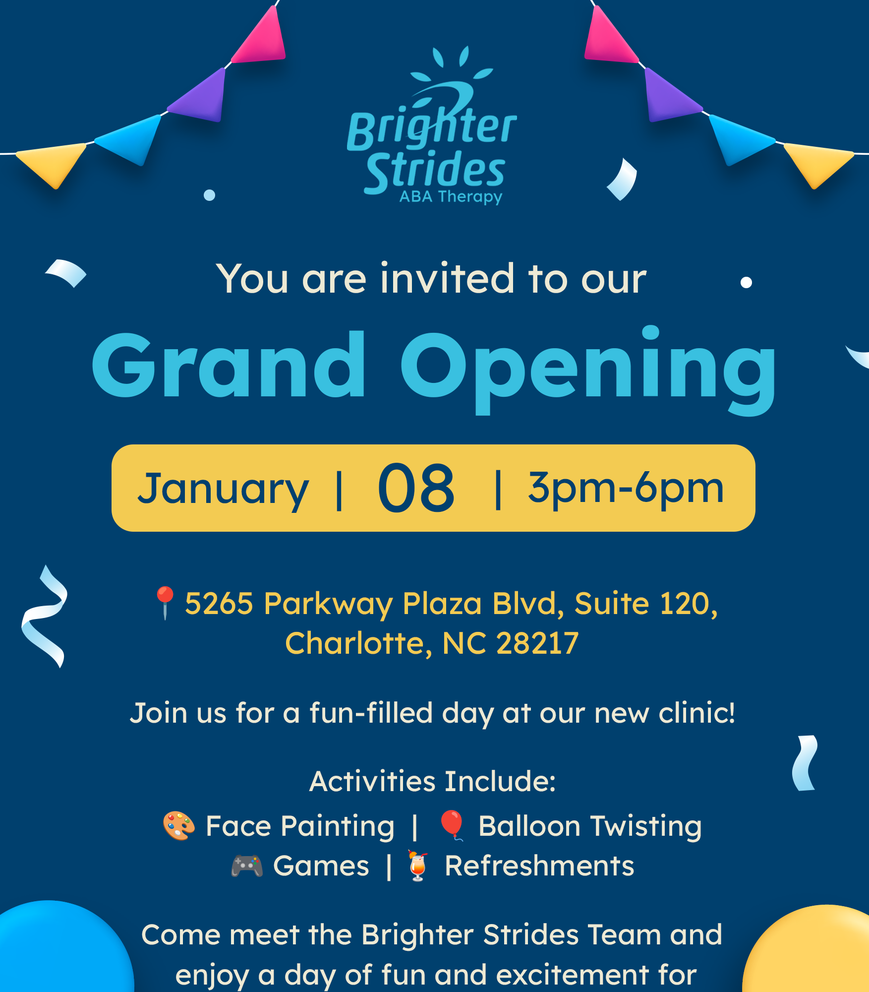We are thrilled to announce the grand opening of Brighter Strides ABA Therapy's new clinic in the Charlotte area! Join us as we celebrate this exciting milestone and our commitment to providing personalized, evidence-based Applied Behavior Analysis (ABA) therapy for children with autism and their families.