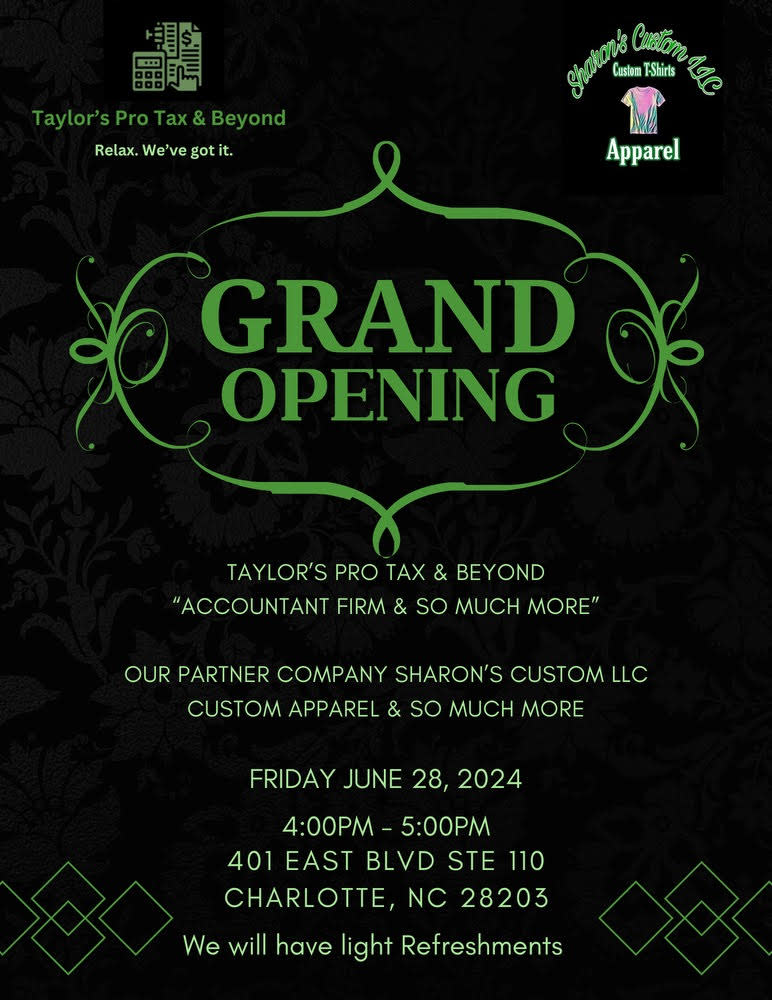 Join us in welcoming Taylor's Pro Tax & Beyond to the Charlotte Area, as we host their ribbon-cutting ceremony which will officially mark the facility's opening, with their partner company Sharon's Custom LLC Custom Apparel & so much more it will be grand opening for the books.