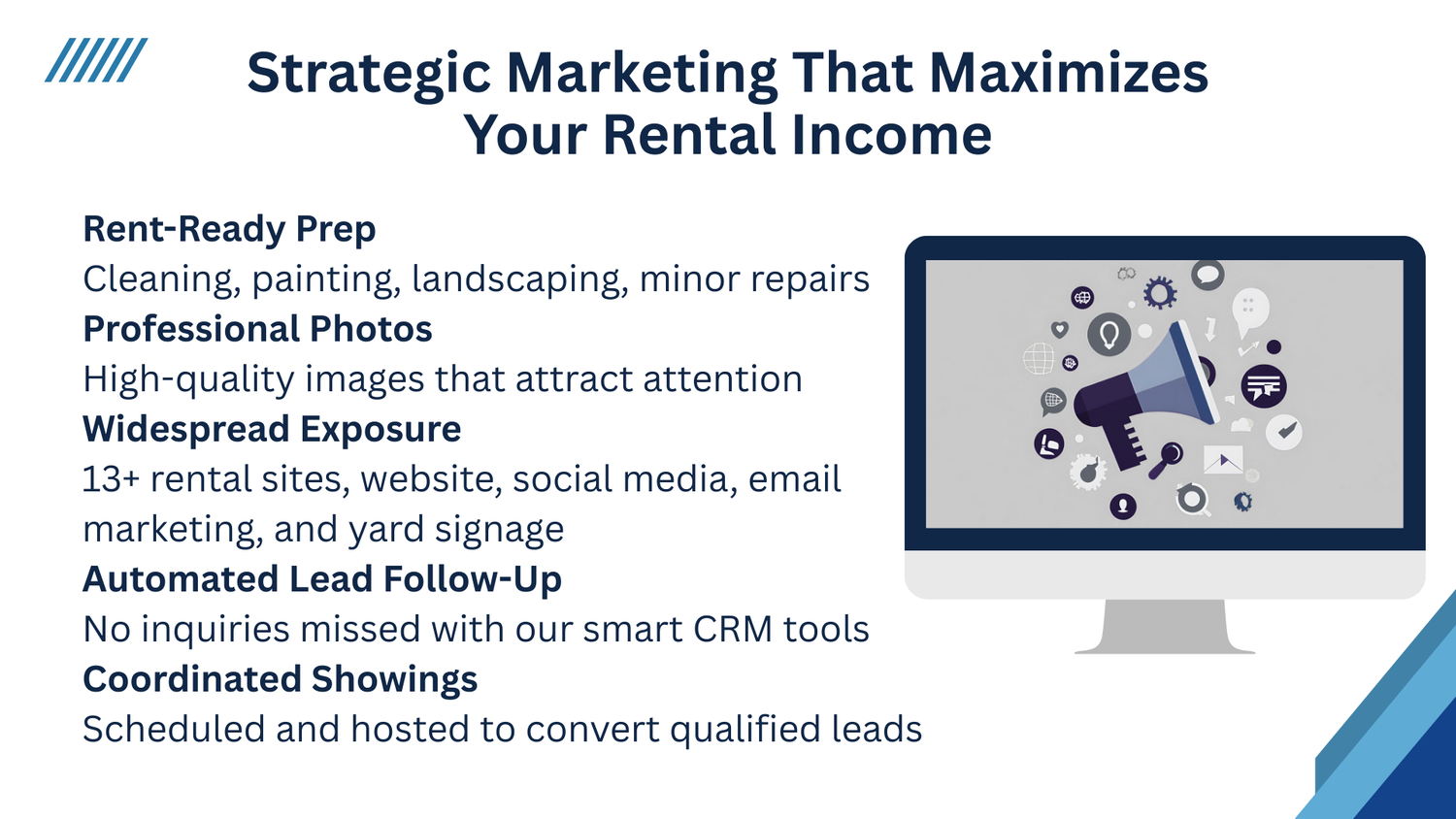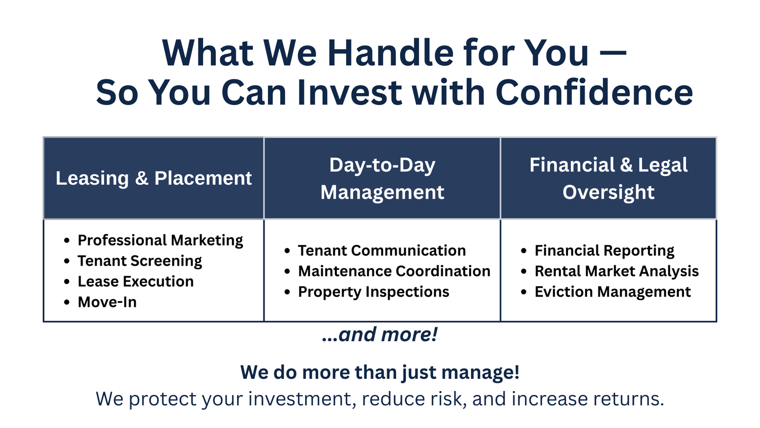 With highly competitive rates, we help keep more money in your pocket, allowing you to grow your portfolio and acquire more properties for us to manage! Your success is our priority, and we're here to make it happen.