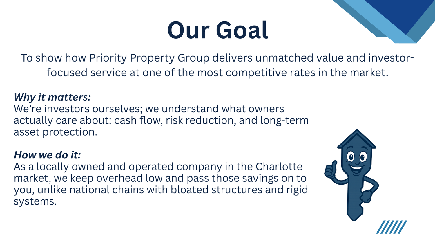 At Priority Property Group, we specialize in full-service property management for investors across Charlotte and the surrounding areas. Our experienced local team focuses on protecting your investment, maximizing returns, and delivering a stress-free ownership experience.