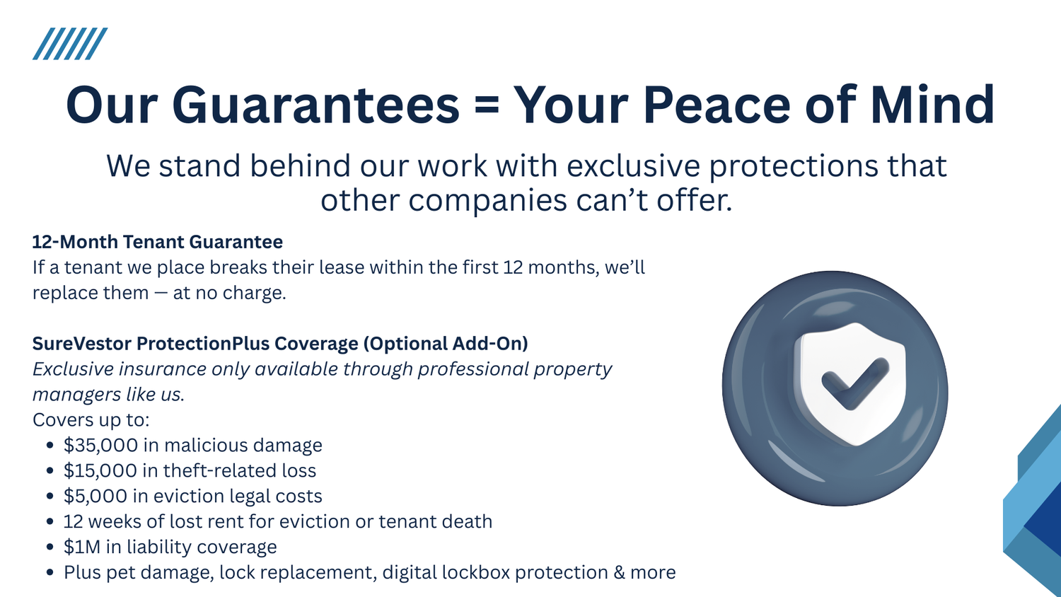 We stand behind our tenant placement services with confidence. If a tenant we placed defaults within the first 12 months, we'll replace them at no additional cost.