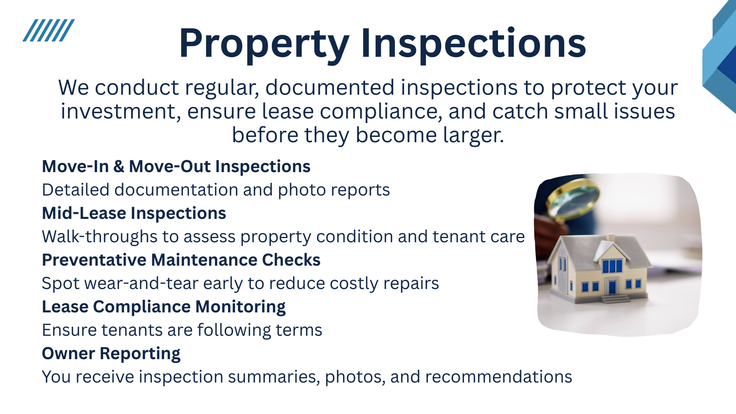 We conduct thorough inspections at key stages to keep your property well-maintained, addressing any issues early. You’ll receive reports with photos for full visibility.